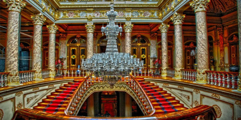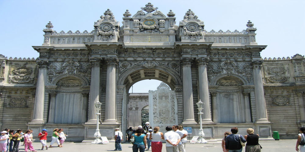 قصر دولما بهشه : الباب العالي مركز الخلافة العثمانية يضم 285 غرفة 46 قاعة يقع على مطل البوسفور